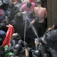Vorwarnung. Hinter uns die anhaltende Prügelei der Einsatzkräfte an der